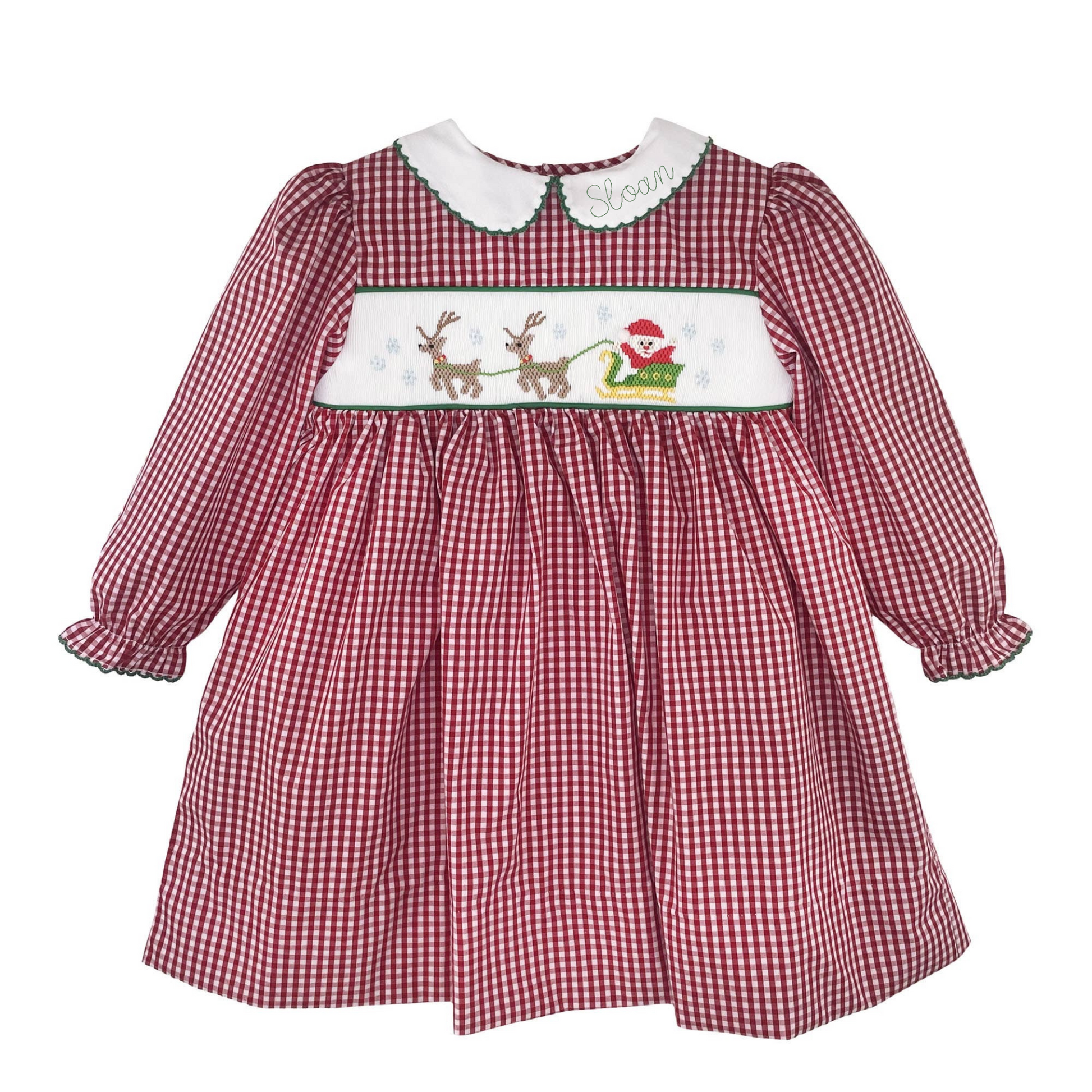 A charming outfit that is perfect for Christmas celebrations and the holiday season from our newest line of hand-smocked clothing made in Vietnam. An exquisite collection with meticulous hand smocked details with a refined touch to make every moment truly special. This long sleeve dress comes in a red and white check fabric with a hand picture smocked scene of Santa's sleigh with his reindeer. A white peter pan collar with green picot trim completes the look - add your child’s name for that extra touch!