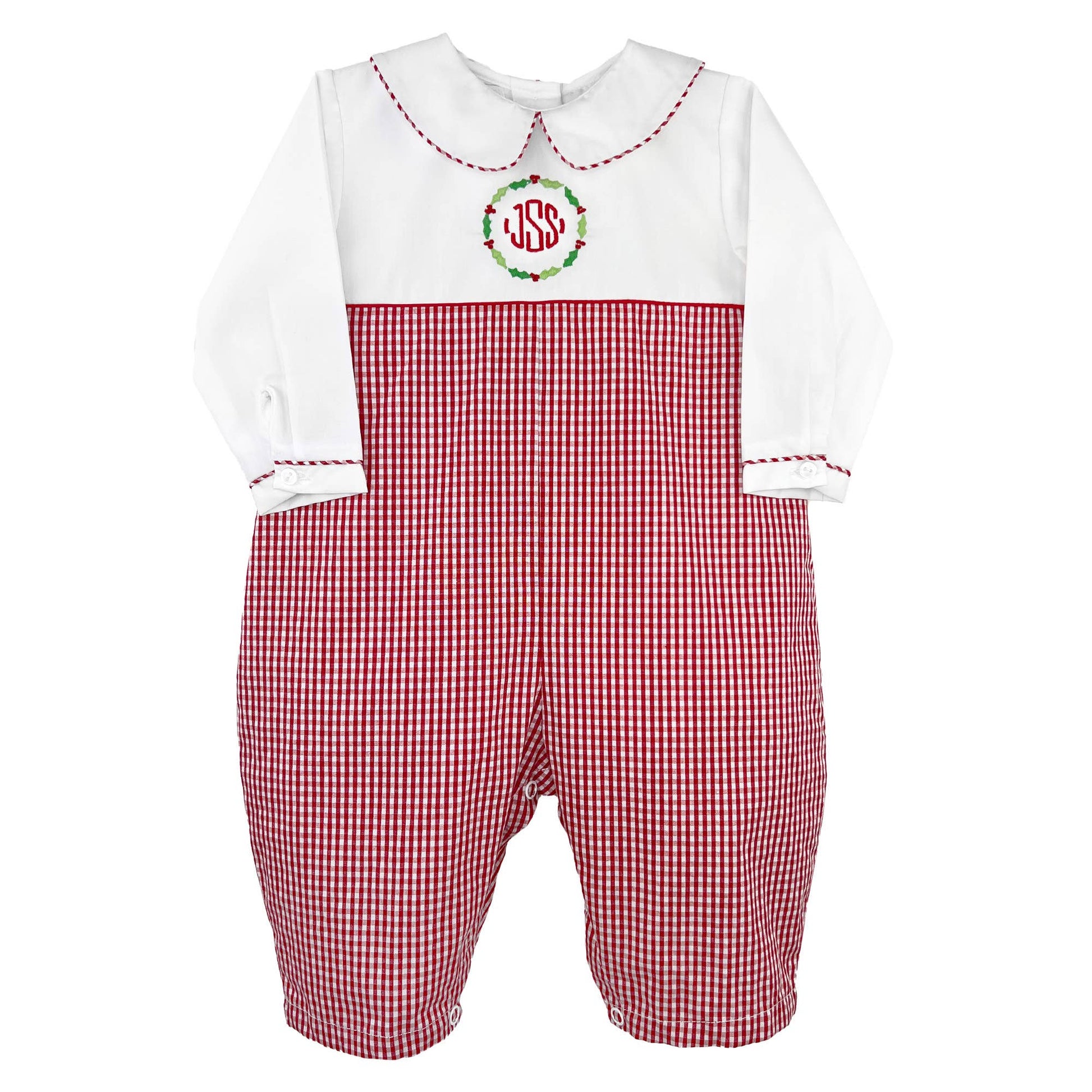 A traditional and classic holiday longall that is simply perfect for the Holiday season. Great for family photos, Christmas parties and visiting with friends and family! This holiday long sleeve romper comes with a white top with an embroidered Christmas wreath and red check skirt with peter pan collar with red trim. This long sleeve romper is made with a light weight cotton-poly blend fabric that is machine washable for easy care too!