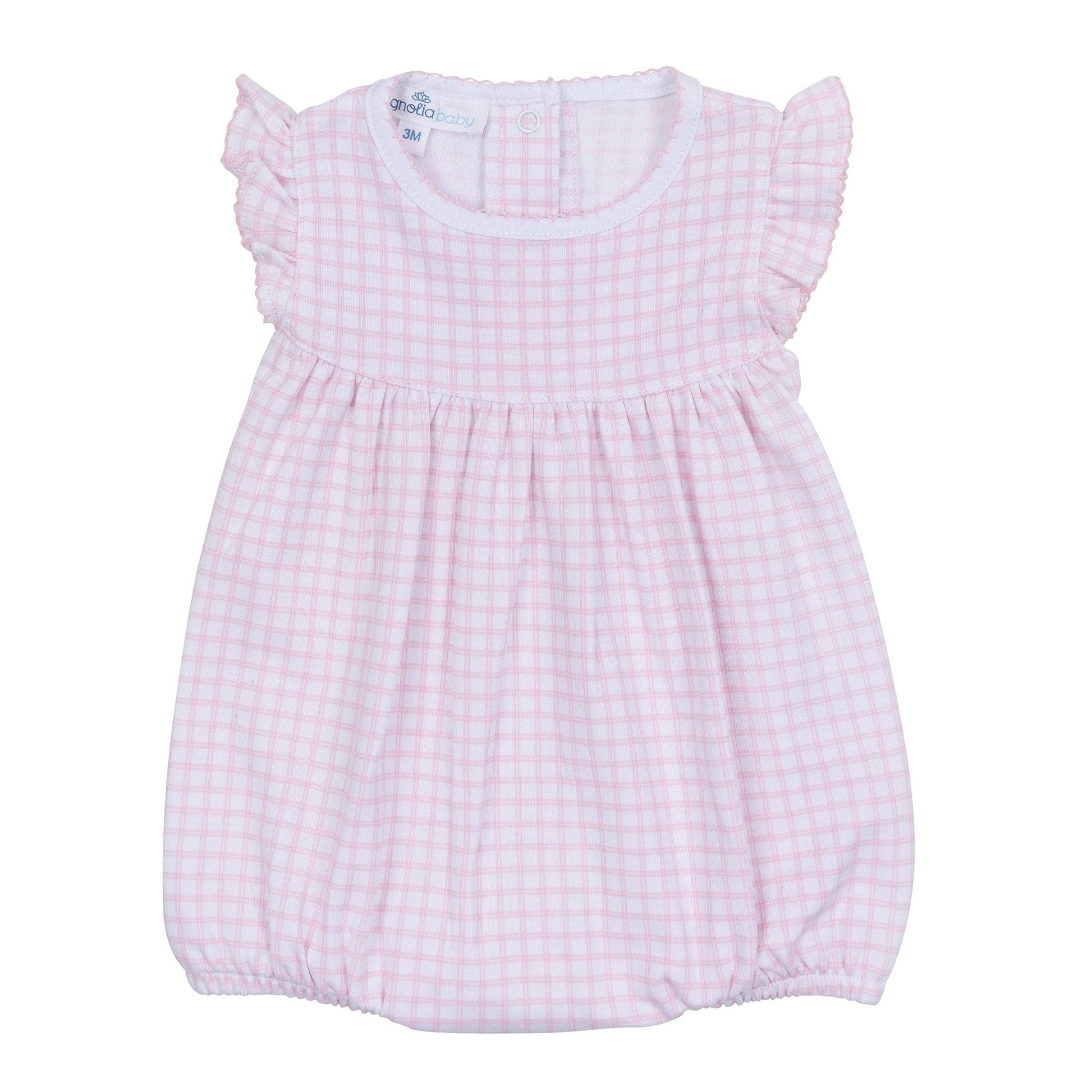 This adorable bubble features delicate pink picot trim and a charming check pattern