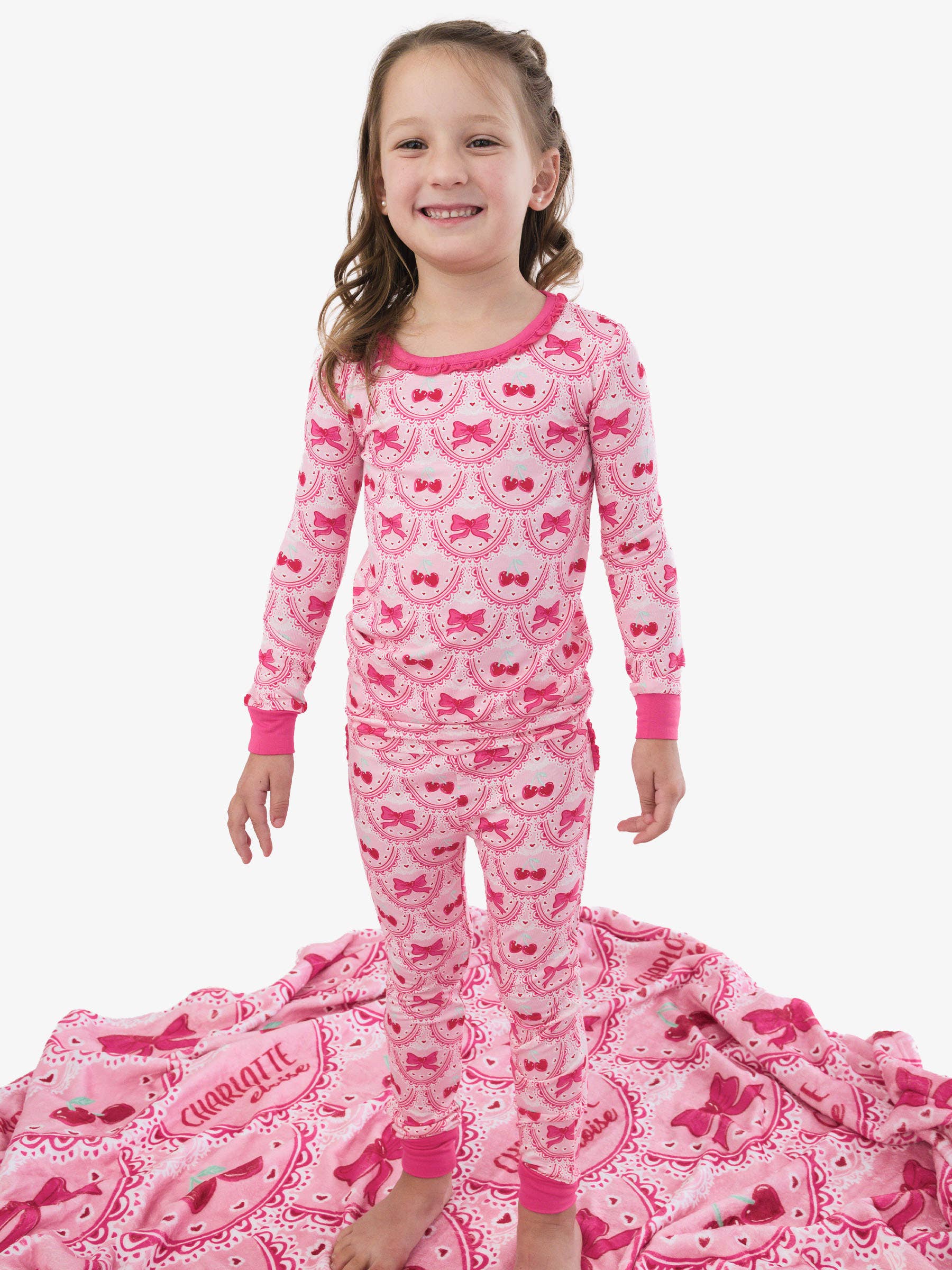This long sleeve sleep set is soft and cozy, with precious ruffles that will bring a smile to your face. A dainty ruffle adorns the neckline of the pajama top, and classic rear ruffles add the finishing touch. Tagless for added comfort. Made from our premium SoftSnooze™ bamboo viscose fabric, these jammies are super snuggly, breathable, and gentle on sensitive skin. The grow-with-me stretch means growing little ones can wear these pajamas for longer! Cherries, bows, and lace doilies make this sweet print perfect for Valentine's Day!